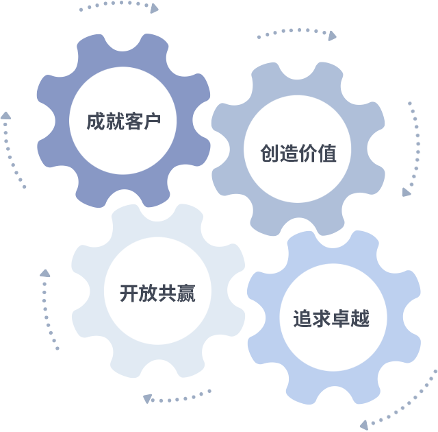 成就客户是一切决策的出发点,,,,创造价值是衡量所有工作的标准,,,追求卓越是我们做事做人的态度,,开放共赢是我们的格局也是最终的结果。。。价值观的齿轮环环相扣,,推动着组织里的每个人不断向前。。